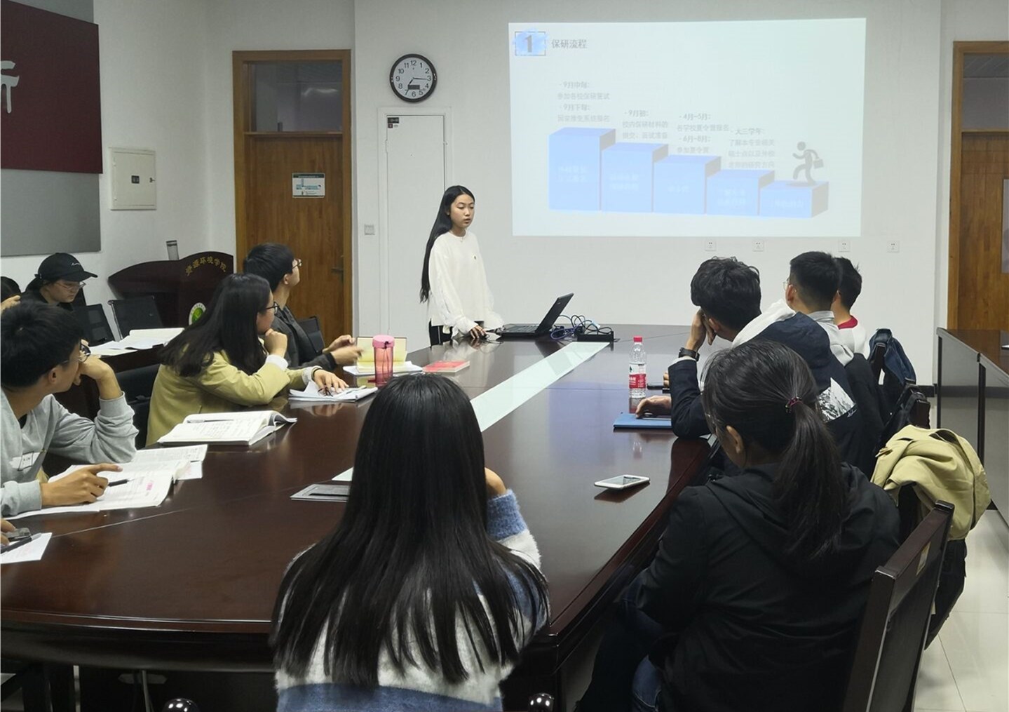 交流保研经验,促进学风建设。本次共有九位保研同志分享了学习经验和推免注意事项。预备党员任明阳首先针对保研历程、政策解读、夏令营注意事项等方面展开了详细的介绍。保送至武汉大学的刘婧婧随后详细介绍了夏令营报名策略——高中低三档,并针对具体学校、学院展开了具体的分析。随后,其他同志也展开了详细的介绍,并补充了自我的学习方法,奉上了满满的建议,使大家受益匪浅。