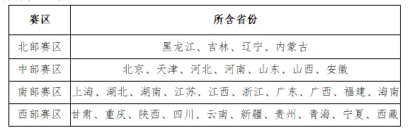 地区选拔赛分为北部赛区、中部赛区、南部赛区和西部赛区,4个分赛区分布如下表: