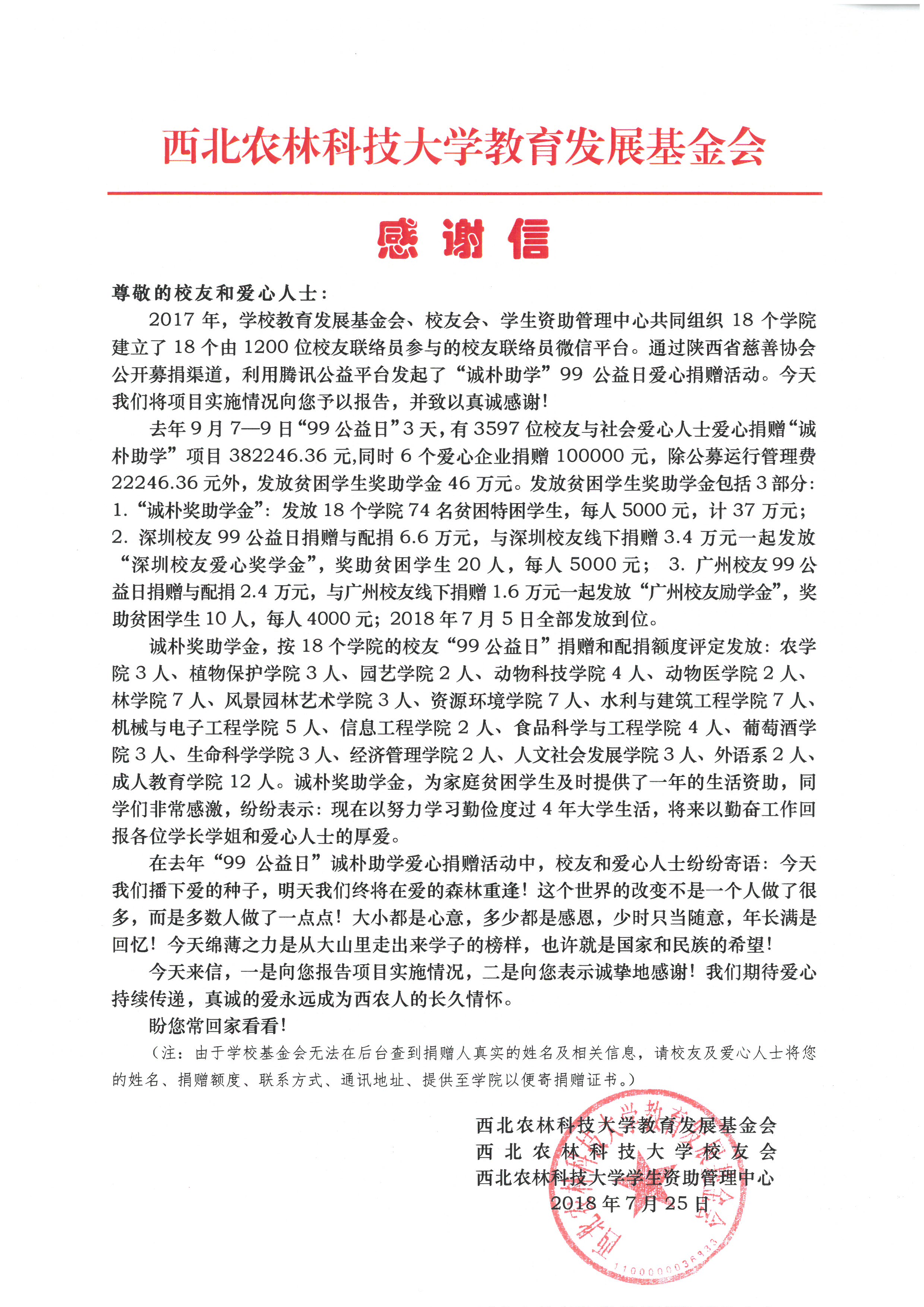 首页» 校友工作» 校友活动» 99公益诚朴助学 给校友感谢信
