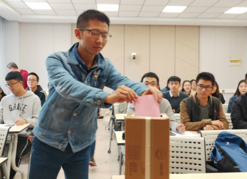 首先,上届支部宣传委员杨静涵同志代表上届支部委员做工作报告,认真对党建工作进行梳理,并对取得的进步、成果和存在的不足进行总结;随后,和红燕老师对换届大会参会情况和候选人情况进行说明和简述;最后按照差额选举原则,符合选举要求情况下,到会党员同志按照无记名投票方式,遵循公开、公平、公正的原则,选举产生出新一届支部委员会。指导教师张青峰老师在讲话中强调,每一位党员的都要不忘入党初心,不进形式上入党更要行动上入党,要严格遵守党内纪律,完成好每项党内任务。同时他建议可以丰富支部活动,比如和教工党支部联合举办活动、到合阳开展党员扶贫工作等,强调要调动党员积极性,逐步加强党支部建设。
