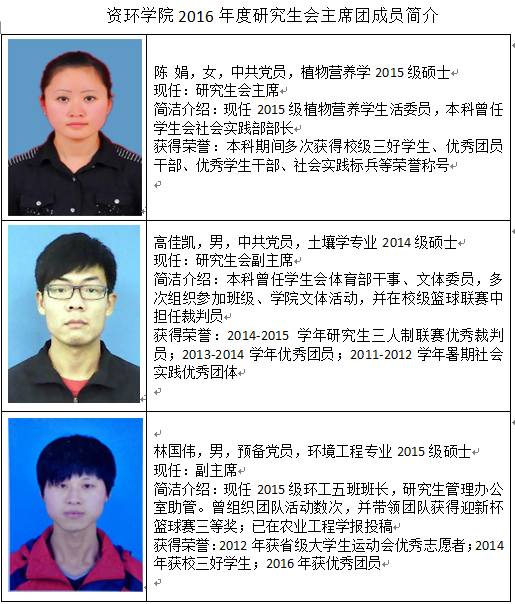 会议开始,院研会主席安伟强首先对研会过去一年的工作进行了总结,他说到,研会在过去的一年各项工作顺利开展,取得了一定的成绩,同时也有不足,并对新的研会主席团成员提出了希望。接着,院党委书记学生工作助理田长河为上一届研会主席团成员颁发了聘书,并合影留念。随后,进行了2016年度研会主席团选举工作。经过公平、公正、公开的程序,与会代表民主投票后,2015级硕士研究生陈娟当选新一届研会主席,2014级硕士研究生高佳凯、2015级硕士研究生林国伟分别当选研会副主席。团工委书记唐帅宣读了关于我院兼职辅导员段晓辉为新一届研究生会秘书长、2015级硕士研究生任艳为新一届团工委副书记的决定。并对新一届研会提出几点建议,希望研究生会能够本着为全体研究生服务的宗旨,切实为我院研究生解决科研和生活中的实际问题。随后,新一届研究生会主席陈娟代表新一届研会做了入职报告,她说,新一届研会要继续发扬我院研会优良的精神风貌,强化研会内部建设,加强研会的工作效率。最后,院党委书记学生工作助理田长河做了总结发言,他首先对上一届主席团成员表示感谢,肯定了他们所付出的努力与取得的成绩,同时对研会今后的发展进行了展望,希望研究生会作为我院研究生代表带领我院研究生在科研和学习上都有更大的进步。