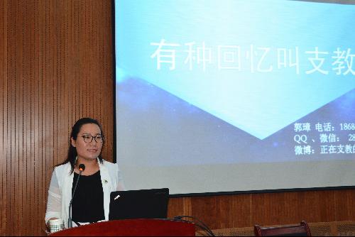 郭璋同学为我院2011级环境工程专业本科生,在校期间品学兼优,曾担任我院团工委副书记。2015年毕业时入选我校第十七届研究生支教团志愿者,任教于陕西省渭南澄城县王庄镇刘家洼学校。支教以来,出色完成所有教学工作,被评为刘家洼学校“星级教学能手”。她策划实施“关注留守儿童,爱心点亮微心愿”系列活动,发动各界力量募捐,搭建起外界联系援助贫困学生的平台。《中国青年报》、《西安晚报》等多家媒体对她的事迹进行专题报道。2016年被授予渭南市五四青年奖章。她带来的支教经历分享,用一个个感人至深的故事,引发同学们对青春的意义、人生的价值、爱心的力量进行思考,大家产生了强烈的共鸣。