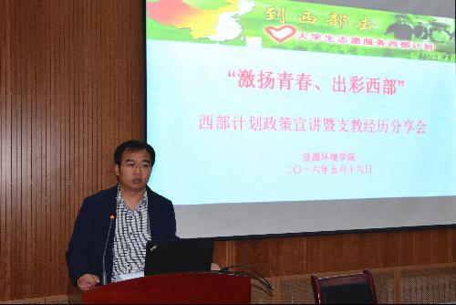 “到西部去、到基层去、到祖国最需要的地方去!”近年来,西部计划吸引着越来越多的大学生、研究生参与其中。5月19日晚,校团委社会实践部部长刘业兴老师和我院2015届毕业生、第十七届研究生支教团成员郭璋同学为学院200余名本科生、研究生带来了一场精彩的政策宣讲与经历分享会。