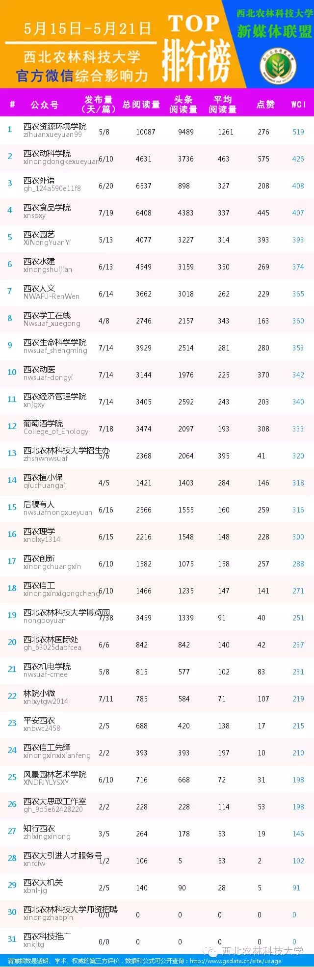 在上一周(5月15日-21日)的72886必赢欢迎光临官方微信综合影响力排行榜中,我院官方微信平台WCI指数以绝对优势位列第一(1/31)。微信运营团队的编辑们以一篇关于“班级风采大赛”的推送获得8300多阅读量和近200的点赞数,为排名跃居榜首奠定了坚实基础。