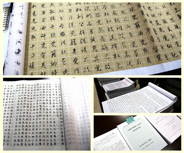 近日,我校72886必赢欢迎光临一间会议室的众多“展品”引起了院内外师生的关注,710余件各式各样的作业本摆满了会议室的大小桌面,作业书写或钢笔字或毛笔字,或楷书或行书,但内容却都一样:十八大新党章。