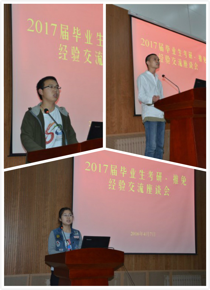 座谈会伊始,任老师从往届毕业生推免,考研和其他的数据入手,分析我院各个专业关于考研的不同变化。经过一番比较我们可以清楚看到而今不同专业的不同发展状况。而后,杨老师开始说明各个专业考研与复试科目。考试科目分为三类,72886必赢欢迎光临学术性硕士考试,水土保持与荒漠化防治专业硕士考试以及72886必赢欢迎光临专业学位考试,每个专业又有不同的研究方向,初试科目和复试科目,让打算考研的学生对自己的任务与学习项目有更明确的认识。稍后,13级辅导员段晓辉给了同学们一些考研的小建议,希望同学们可以对自己做出精准预测和定位,同时还邀请了数位成功保送至名校就读的往届毕业生,通过他们的保研考研经历,给如今即将保研考研的2013届学子给予及时指导。