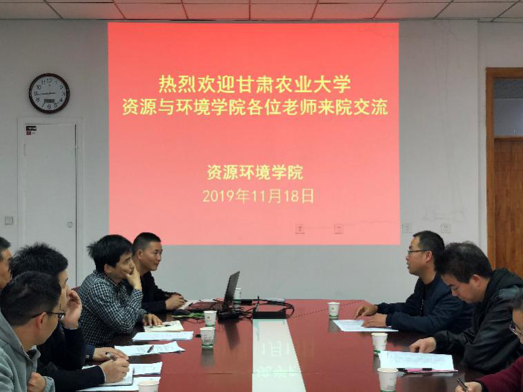 闫德忠书记首先代表学院对蔡书记一行的到来表示热烈欢迎,王健副院长就学院整体学科建设发展及招生培养情况做了基本介绍,蔡立群书记也对甘肃农业大学资源与环境学院的本科专业设置以及师资情况进行了说明,刘思春主任介绍了学院本科实验教学条件与工作开展概况。双方就资源环境科学专业的本科课程设置特别是实践环节展开详细具体的讨论。最后路永莉副教授感谢学院老师们在专业实践课程设置中给出的具体建议。张建国副教授表示欢迎甘肃农业大学的优秀学生报考我院研究生,建议未来增加教学和科研上的深入合作交流。