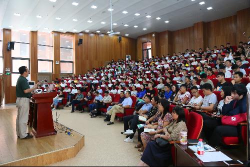 接着,学院党委书记闫德忠为新生上了第一课——坚定理想信念,勇攀科学高峰。闫书记以十九大报告重要讲话为切入点,围绕信仰、文化自信及价值观三个方面为新生作报告。使新同学触及、进入、以及思考理想信念这一命题。他博古论今,引经据典,引导学生思考如何坚定理想信念,思考如何将个人发展融入社会与国家的发展,将个人价值发挥到最大。当谈到信仰、文化已经价值观问题时,闫书记为同学们剖析了宗教信仰与宗教问题,并提醒在校学生特别是的党员同学一定要头脑清醒,心理明白,不要迷失方向,选错立场。最后闫书记以“头脑清晰比实力更重要”,“坚持独立思考,时刻反省”,“奋斗的青春是幸福的”三句话送给新生,给予学生深刻启发。