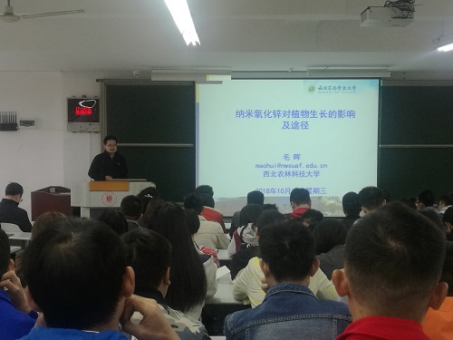 吕家珑院长为贵州大学农学院和资源与环境工程学院本科高年级学生就我院硕士研究生招生政策进行详细解读。毛晖副教授作了题为“纳米氧化锌对植物生长的影响及途径”的学术报告,农学院及资源与环境工作学院的部分教师和学生120多人参加了报告会。