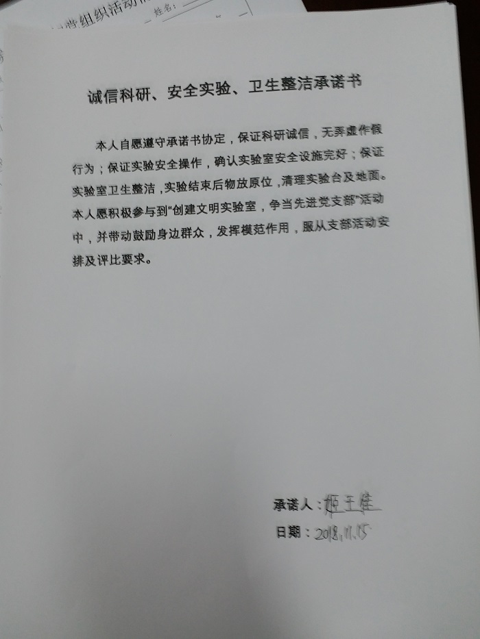 首先,支部书记杜泽坤带领各位党员及积极分子学习两个文件的主要内容并结合学校学院特点针对性的提出“创建文明实验室,争当先进党支部”的活动构想,明确此次活动对支部班子建设和广大学生党员和群众提高思想认识、厚植文明情怀的重要意义。接着支部书记杜泽坤率先签订《诚信科研、安全实验、卫生整洁承诺书》,其他党员及积极分子对活动意义表示高度认同签订承诺书,希望用自身行动树立先进典型。
