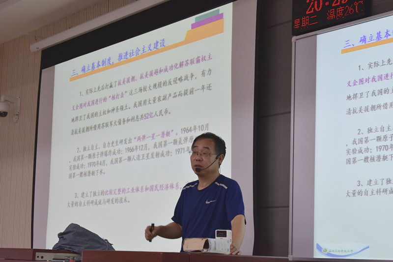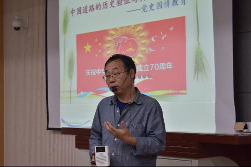 活动始伊,方建斌以1949年新中国成立这一重要历史事件讲起,概述了七十年来取得的巨大成就。“新中国成立70年以来,在中国共产党的领导下,中国在军事、经济、文化等方面蓬勃发展,中国人民也靠辛勤的劳动不断创造着更加幸福的小康生活。”随后,方教授以习近平总书记在2013年中央领导第七次集体学习中的讲话“学习党史、国史,是坚持和发展中国特色社会主义、把党和国家各项事业推向前进的必修课”为例,讲解了中国共产党始终与人民站在一起,始终代表中国最广大人民的根本利益的核心观念。在党史方面,从中共一大、二大反帝反封建的纲领讲起,贯穿了土地革命、长征、遵义会议等重要历史事件,阐述了中国共产党为实现民族独立,建立新中国而做出的巨大贡献。最后,他详细为同学们介绍了中国特色社会主义的概念和发展道路,以及其蕴含的科学性和革命性,并呼吁同学们要建立民族自信,为实现中国梦的伟大复兴之路而不息奋斗。