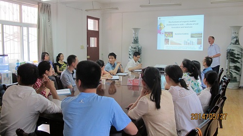 5月27日下午,来访的荷兰阿姆斯特丹大学生物多样性与生态系统中心的Karsten Kalbitz教授为我院师生作了题为“Mechanisms of organic matter stabilization in soils – effects of soil formation and land use” 的学术报告,我院部分教师以及研究生参加了报告会。报告中Kalbitz教授重点介绍了带领的研究团队在土壤有机碳稳定性机理方面的最新研究进展,内容包括溶解性有机碳(DOC)在森林土壤剖面的运移与转化,不同时期发育稻田土壤有机及无机碳的动态变化及影响因素,水土侵蚀过程对土壤有机碳迁移、沉积及稳定性的影响等。