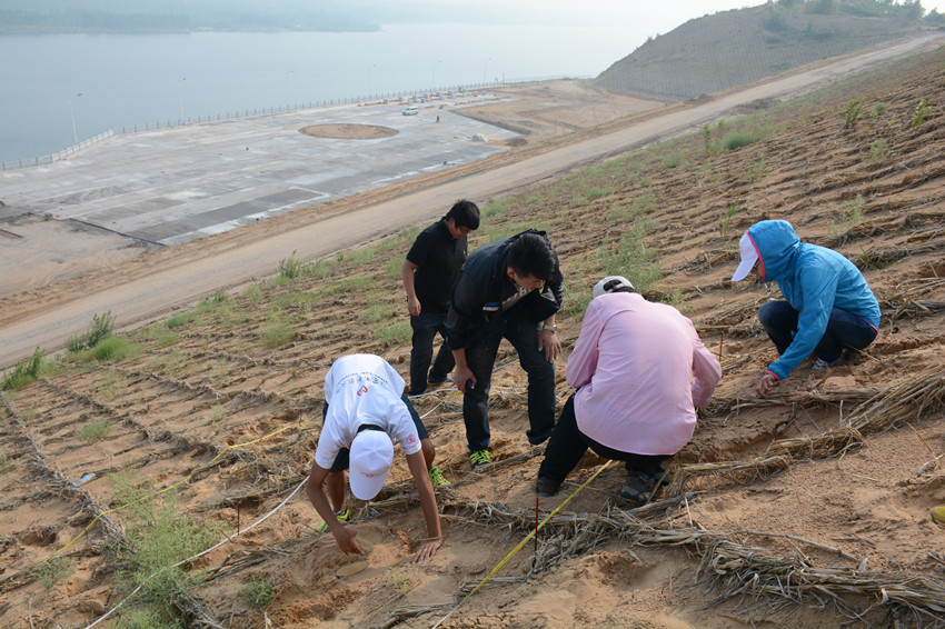 在横山县,服务队观测考察了王圪堵水库。服务队成员测量了水库附近的沙坡坡度,植物覆盖度,留下了队员们辛勤工作的脚印。在神木县,服务队首先赶赴72886必赢欢迎光临水土保持研究所神木侵蚀与环境试验站。试验站位于淤地坝上,众多实验田分布其上,硕、博士研究生在此进行各种沙地、坡地水保试验,服务队成员与他们进行了认真交流和学习。随后,服务队在柠条塔矿业公司进行了考察,实地观测、学习了该煤矿完善的水保方案实施,真切感受到了水保工作使煤矿矿区旧貌换新颜的力量!