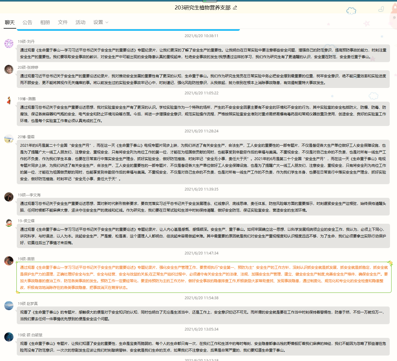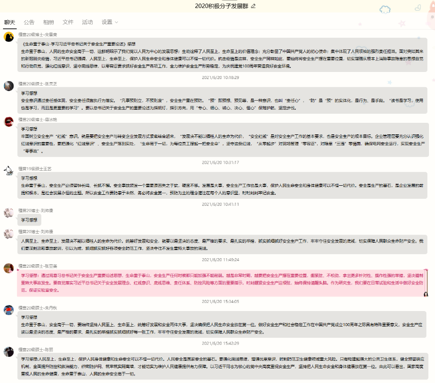本次学习也在2019级、2020级入党积极分子群、硕士193团支部同时开展,每位积极分子也都参与其中。2019级积极分子徐风嶷谈到:作为一个研究生,实验室是我们日常的地方,过往的实验室安全事故应当给我们以警示,我们应当强化安全意识,落实安全主体责任,加强安全基础能力建设,坚决遏制安全事故的发生。2020级积极分子张亚美也发表了自己的感想:要自觉落实习近平总书记关于安全发展理念、红线意识、底线思维、责任体系、防控风险等方面的重要指示,时刻绷紧安全生产这根弦,始终保持清醒头脑。作为研究生,我们要在日常试验和生活中做好安全防范,保证实验室安全。宋景荣、张灵芝、毋冰艳、王艺、刘帅康、朱丹秋、陈丽等同学也积极讨论,发表学习感悟。