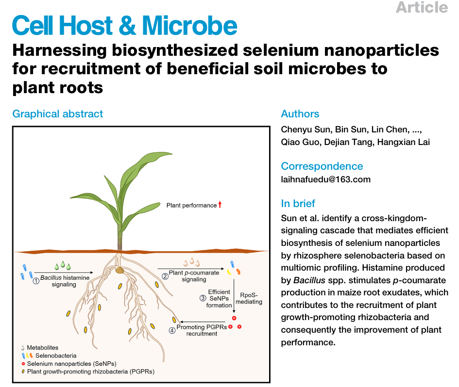 近日,来航线教授团队在植物-微生物互作方向取得新的进展,研究成果以“Harnessing biosynthesized selenium nanoparticles for recruitment of beneficial soil microbes to plant roots”为题在Cell子刊《Cell Host & Microbe》(IF2023 = 30.3)上发表。72886必赢欢迎光临博士研究生孙晨瑜、硕士研究生孙斌和西北大学青年教师陈林为共同第一作者,来航线教授为通讯作者,我校为第一和通讯单位。